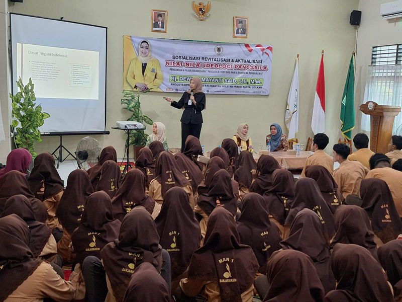 JURNALKALIMANTAN.COM, BANJARMASIN – Puluhan pelajar Madrasyah Aliyah Negeri (MAN) 1 Banjarmasin menyambut gembira Sosialisasi Revitalisasi dan Aktualisasi Nilai-Nilai Ideologi Pancasila atau wawasan kebangsaan (Wasbang) yang dilaksanakan oleh anggota DPRD Kalsel, Hj Dewi Damayanti said belum lama tadi.