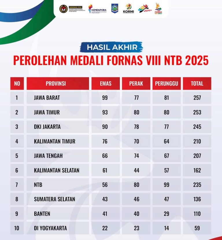 Berdasarkan data resmi yang dirilis akun Fornas VIII NTB 2025, KORMI Kalsel mengumpulkan total 162 medali, terdiri dari 61 emas, 44 perak, dan 57 perunggu.