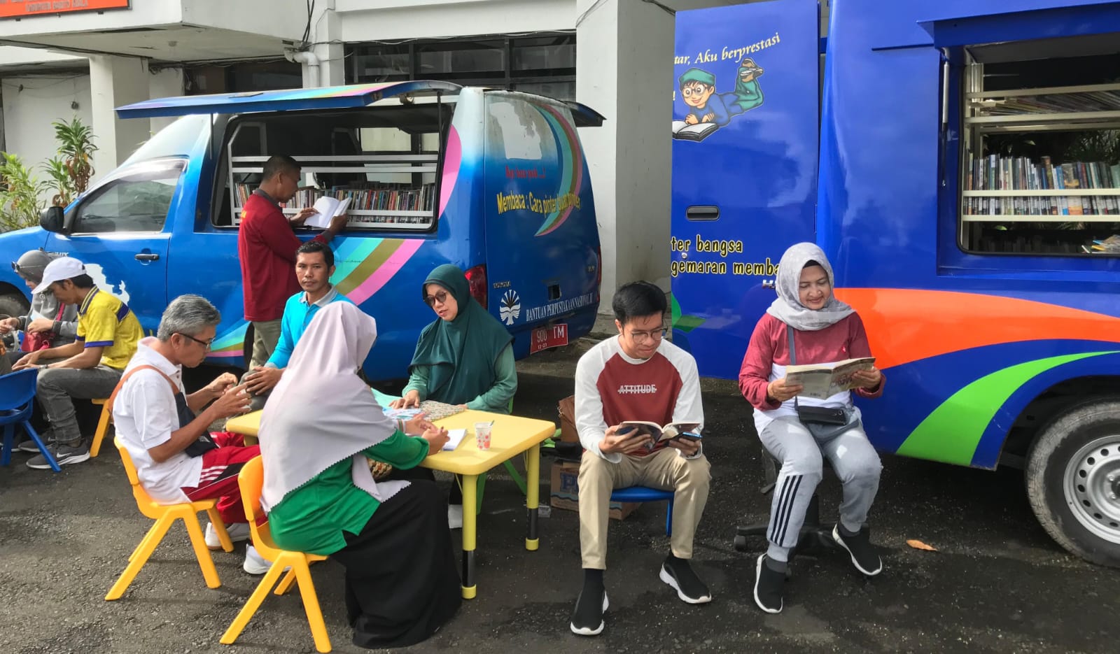 Suasana yang nyaman dengan tambahan kursi dan meja, menjadi daya tarik masyarakat untuk mempir, menyambangi 2 buah mobil perpustakaan keliling ini.