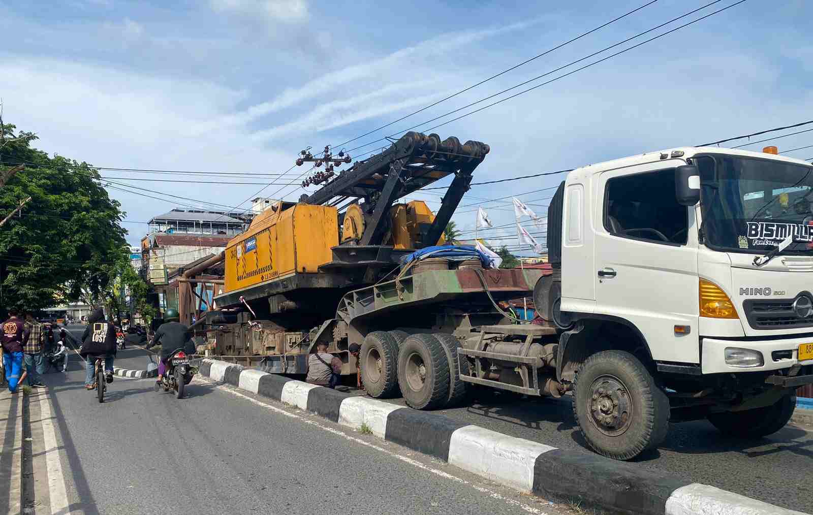 JURNALKALIMANTAN.COM, BANJARMASIN – Sebuah truk gandeng pengangkut alat berat jenis cran tersangkut di Jembatan II Pekapuran, Jalan Kolonel Sugiono Kelurahan Pekapuran Laut, Kecamatan Banjarmasin Tengah, Senin (11/2) siang.