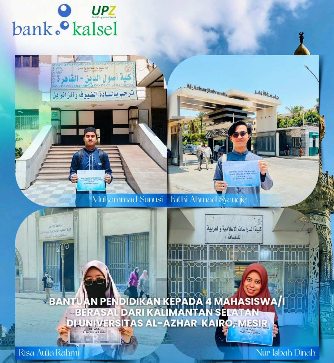 JURNALKALIMANTAN.COM, BANJARMASIN – Unit Pengumpul Zakat (UPZ) Bank Kalsel kembali menunjukkan komitmennya dalam mendukung dunia pendidikan. Kali ini, bantuan pendidikan disalurkan kepada empat mahasiswa asal Kalimantan Selatan yang sedang menempuh pendidikan di Universitas Al-Azhar, Kairo, Mesir.