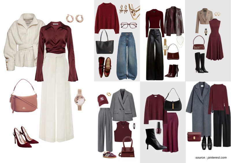 Untuk tampilan sehari-hari, padukan warna burgundy dengan warna-warna netral, seperti krem, abu-abu, hitam hingga cokelat muda.
