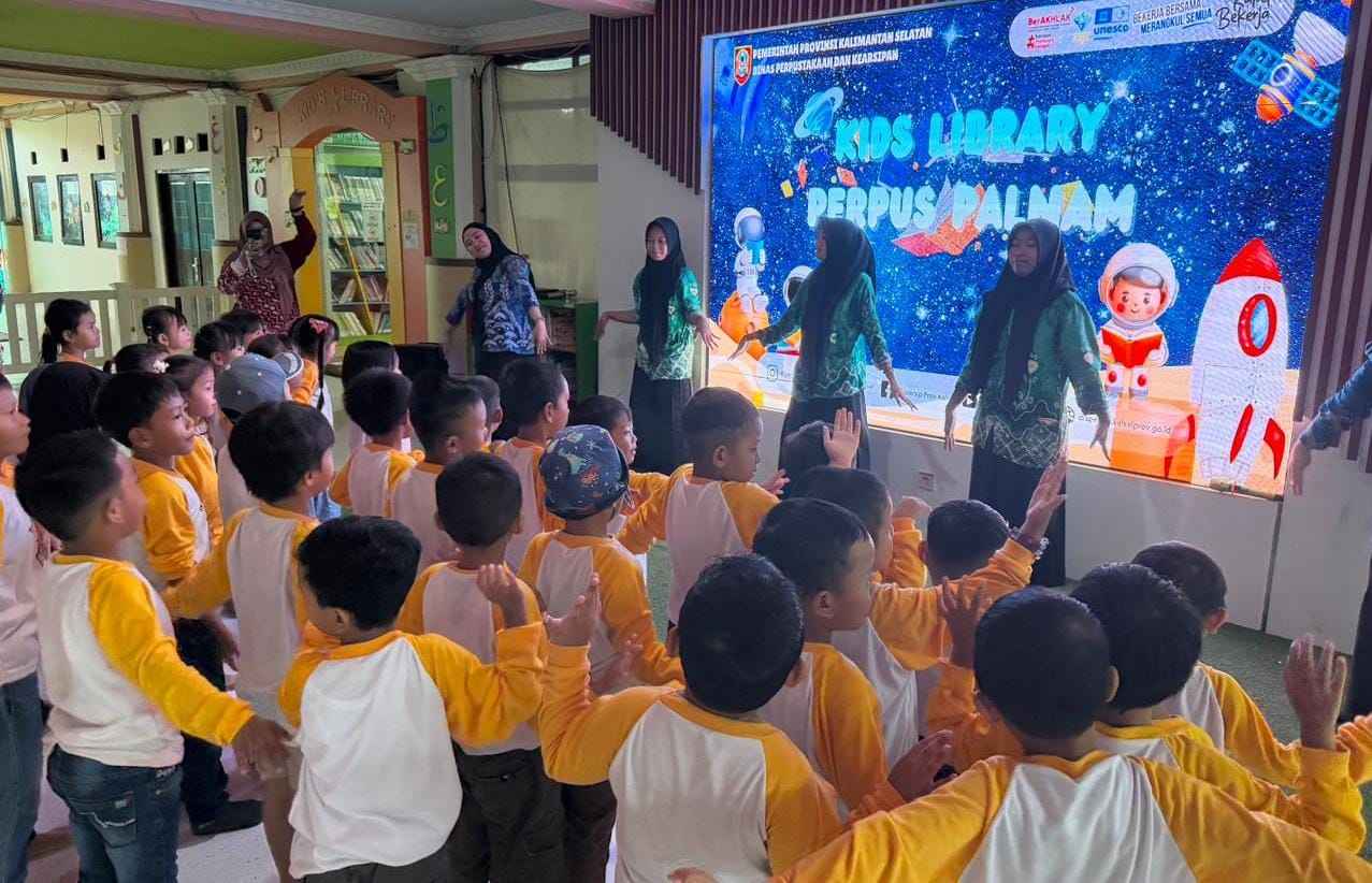 Selain layanan perpustakaan umum, area perpustakaan anak menjadi salah satu fasilitas yang paling diminati. Sejumlah lembaga pendidikan secara bergantian datang mengikuti kegiatan wisata literasi, kali ini dari TK Ar-Raudah Banjarmasin yang membawa 67 anak didik.