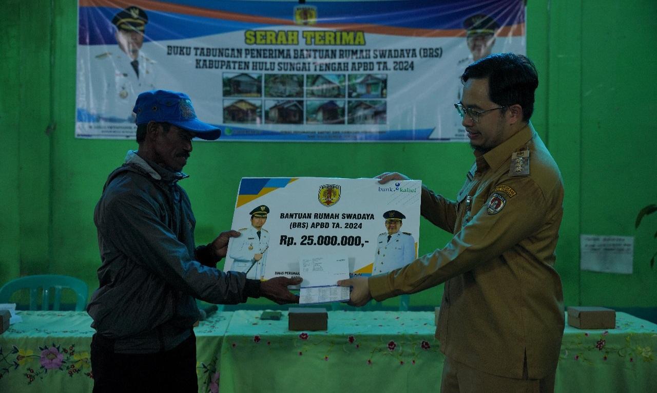 JURNALKALIMANTAN.COM, HULU SUNGAI TENGAH – Bupati Hulu Sungai Tengah (HST) H Aulia Oktafiandi, memyerahkan secara simbolis buku tabungan kepada penerima bantuan rumah swadaya, yang menandakan dimulainya tahapan pelaksanaan pembangunan fisik bantuan rumah, di kawasan permukiman kumuh dan luar kawasan permukiman kumuh Tahun Anggaran 2024.
