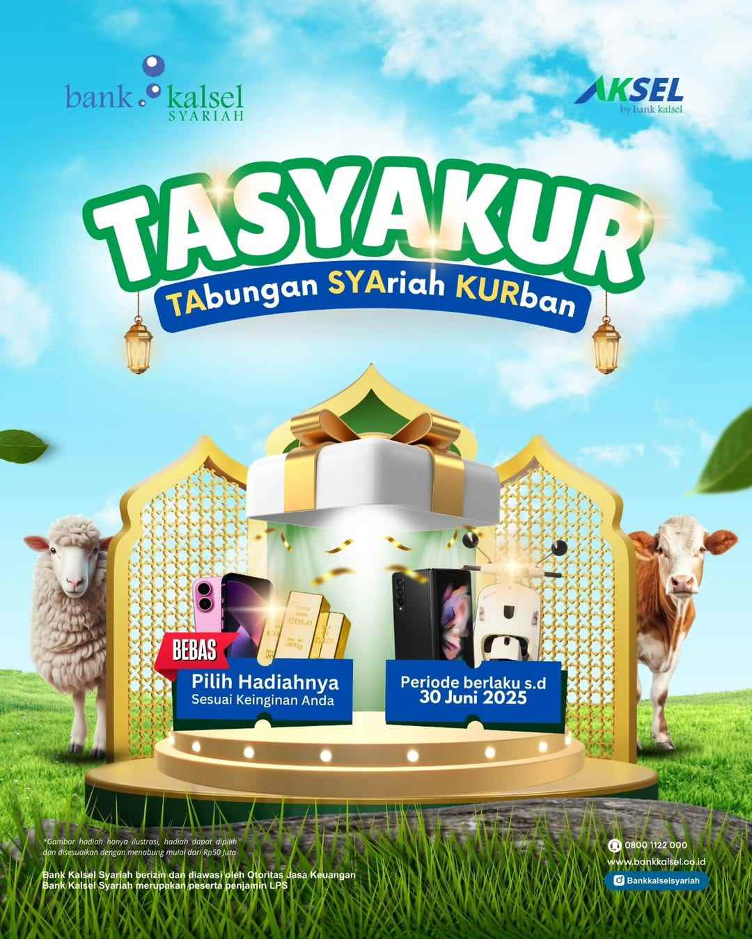 JURNALKALIMANTAN.COM, BANJARMASIN – Bank Kalsel Syariah memberikan hadiah Kurban atau dengan memilih sendiri hadiahnya. Anda bisa mendapatkan hadiah kurban langsung ataupun hadiah lainnya tanpa diundi dengan mengikuti program TASYAKUR (Tabungan Syariah Kurban) yang berlaku sampai dengan 30 Juni 2025.